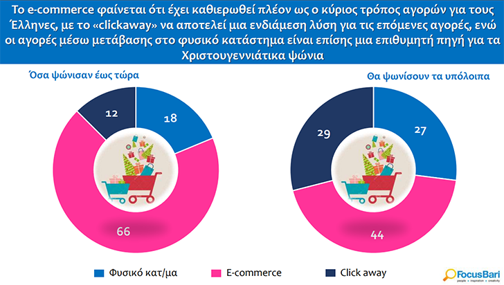 Στο μεταξύ, απ’ όσους Έλληνες δεν έχουν κάνει ακόμη τις εορταστικές αγορές, ένα ποσοστό 44% απαντά ότι θα το κάνει online. Υπάρχει και ένα ποσοστό αρκετά σημαντικό, της τάξης του 27%, που απαντά ότι θα χρησιμοποιήσει τη μέθοδο “click away”.