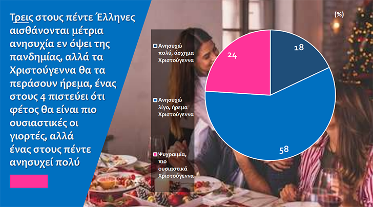 Παρ’ όλα αυτά, οι τρεις στους πέντε Έλληνες δηλώνουν ότι αισθάνονται κάποια ανησυχία λόγω πανδημίας και περιμένουν τα Χριστούγεννα να περάσουν ήρεμα και ήσυχα. Ένας στους 4 πιστεύει ότι φέτος θα είναι πιο ουσιαστικές οι γιορτές, αλλά ένας στους πέντε ανησυχεί πολύ.